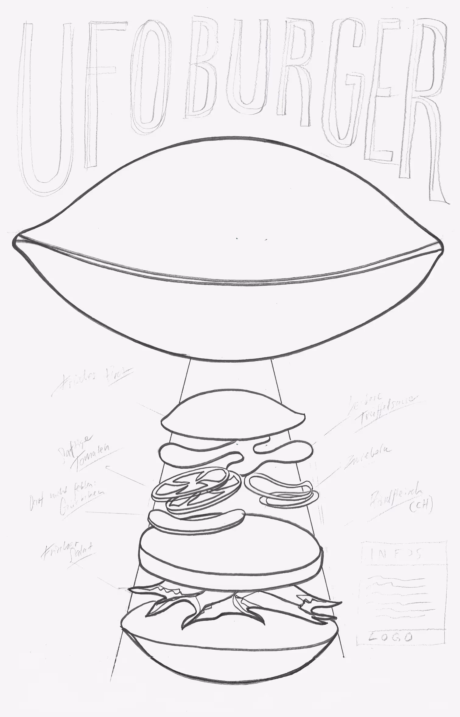 Plakat für den Ufoburger, bei dem die Brothälften zusammengefügt werden. Die Gestaltung macht den Inhalt für Konsument*innen sichtbar.