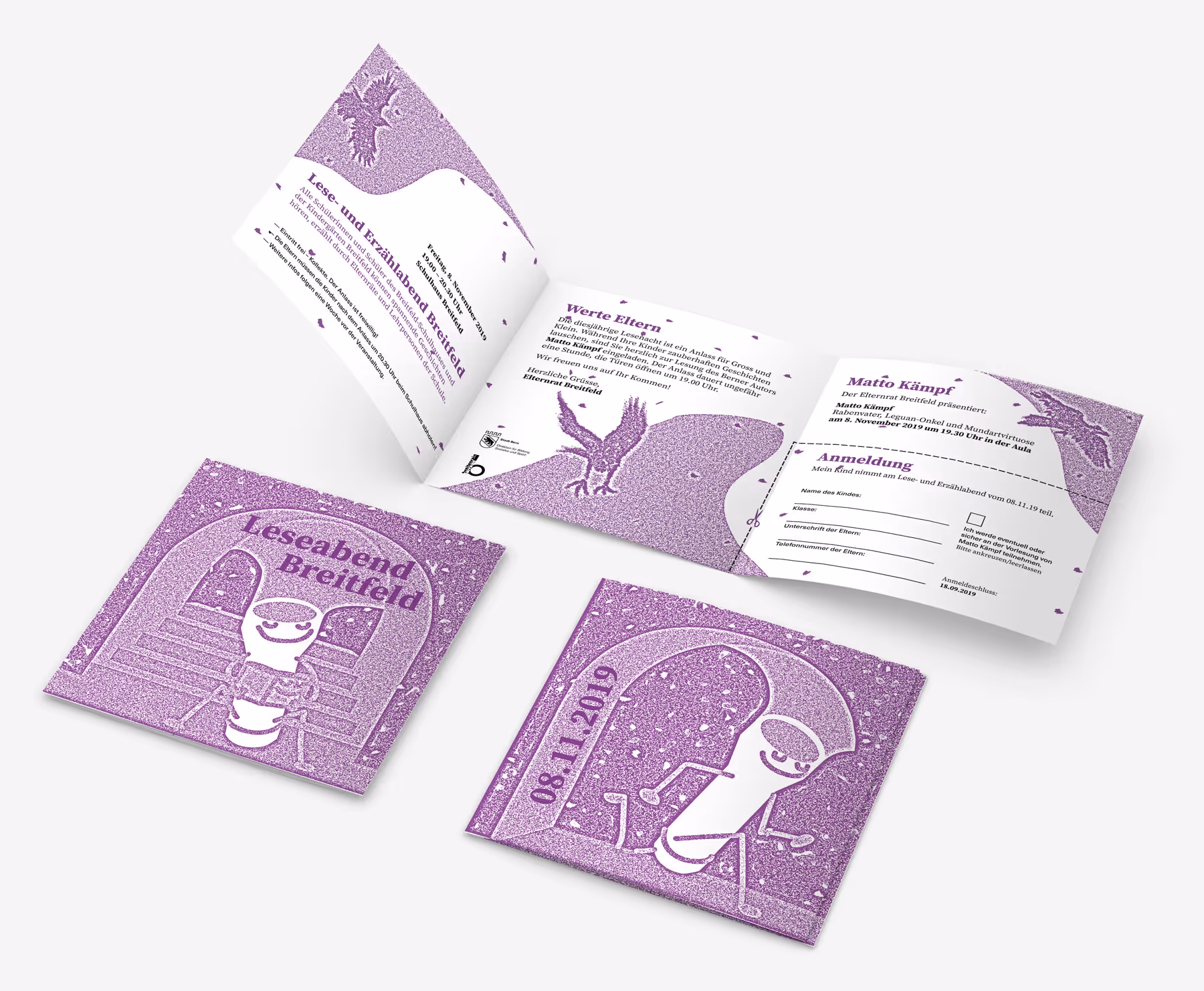 Drei lesende Taschenlampen: Flyer für Lese- und Erzählabend im Schulhaus Breitfeld. Die Gestaltung nimmt Bezug zur Architektur des Schulhauses (siehe unten «Prozess und Kontext»).