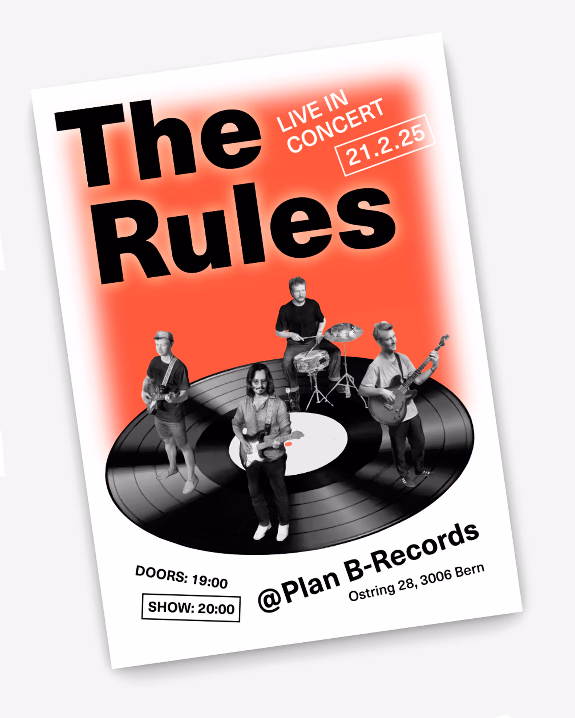 Flyer für Konzert von unserer Band «The Rules» im Plattenladen B-Records. Der 3D-Effekt erzielte ich mit Ganzkörper-Scans der Bandmitglieder («bitte nicht bewegen»).