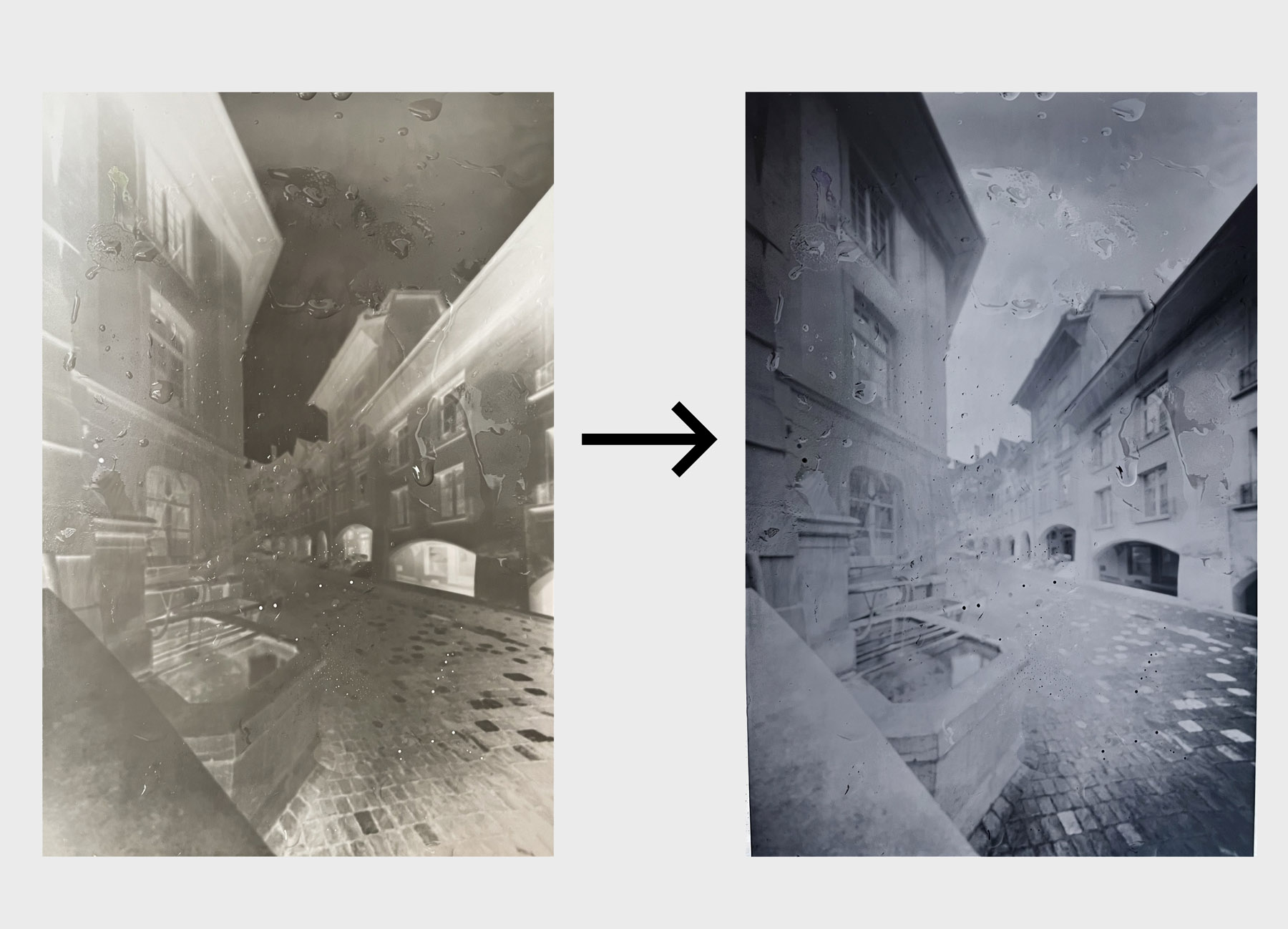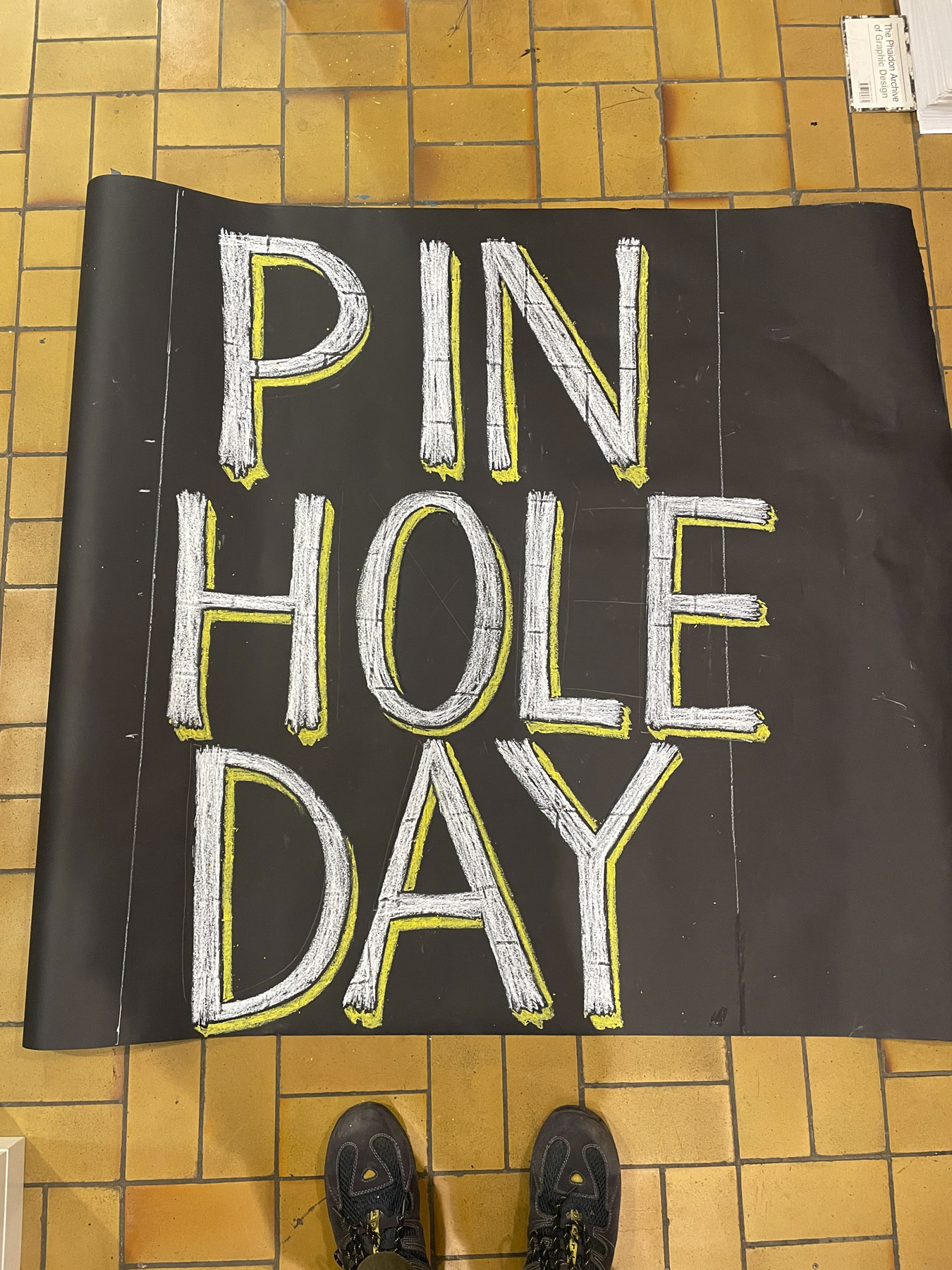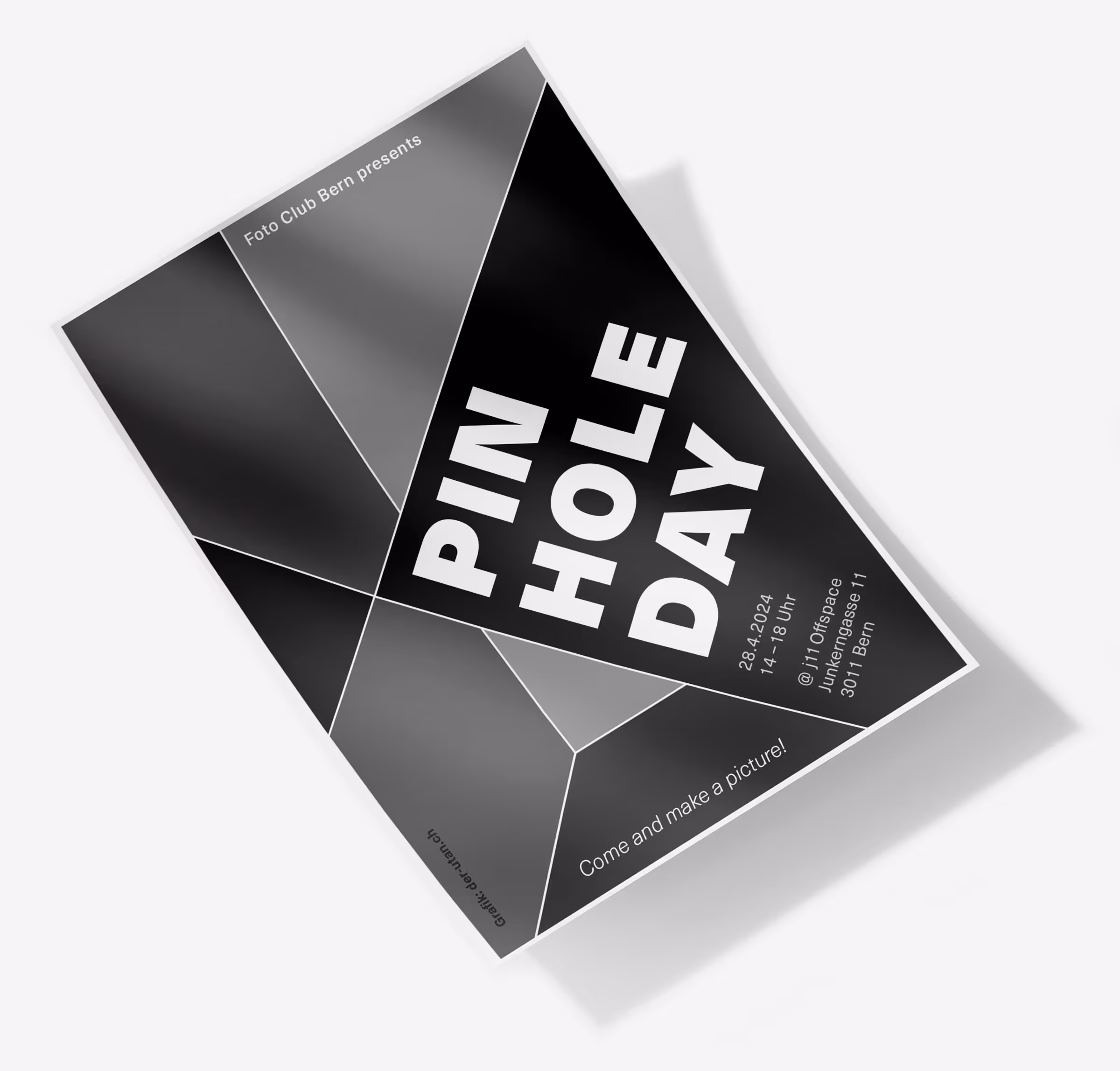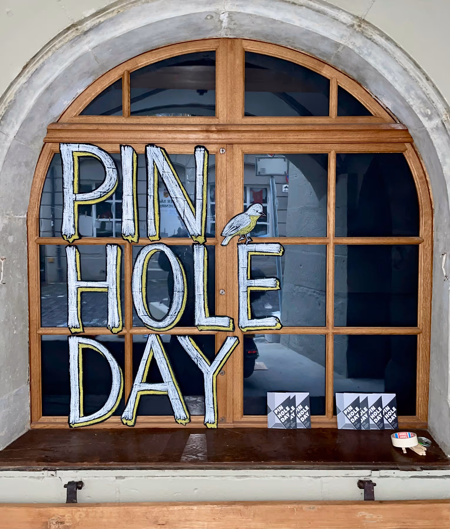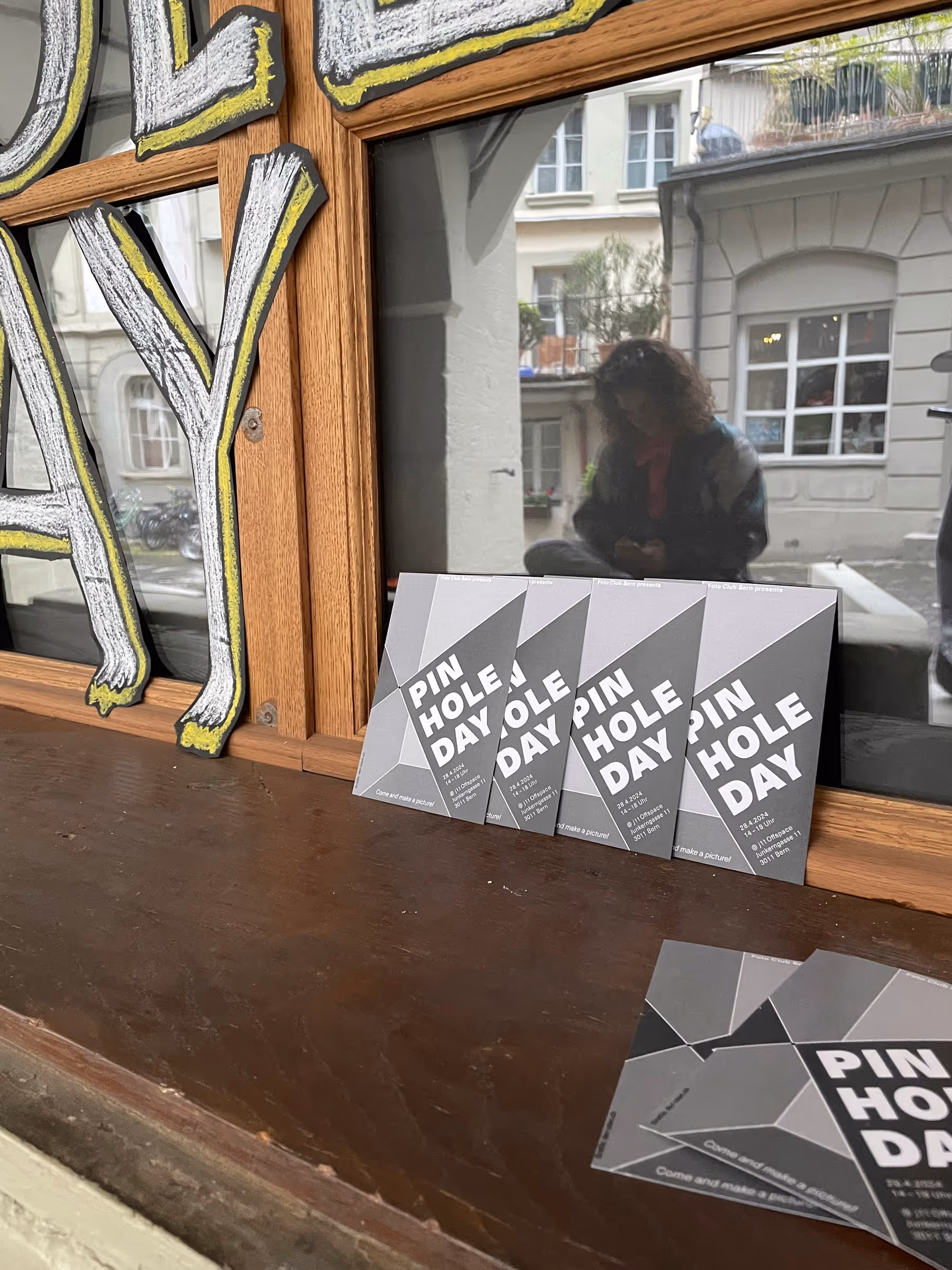 Flyer für den «Pinhole Day» in der Berner Altstadt, bei dem Passant*innen Fotos mit einer Camera Obscura machen konnten. Dazu begleitendes Lettering (siehe unten «Prozess und Kontext).